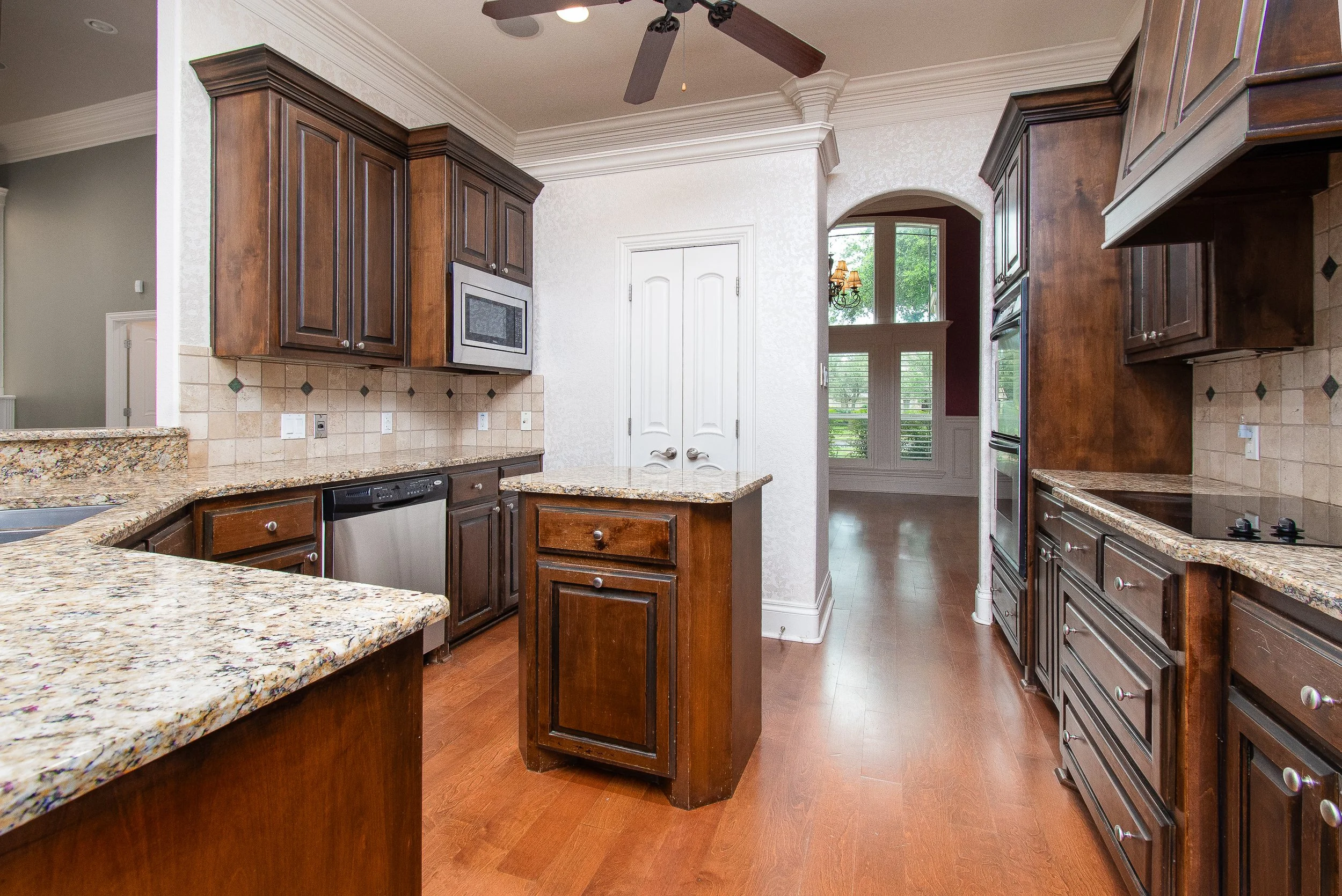 Continuing through the home, we find ourselves in the heart of the residence: the custom kitchen. Designed with both style and functionality in mind, this culinary haven boasts granite countertops and custom cabinetry. A spacious island and bar seating provides the perfect spot for casual meals and entertaining, while a cozy breakfast nook overlooks the backyard oasis.
